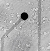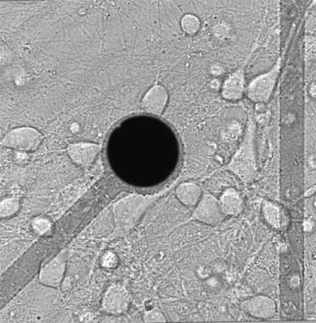 View microscope: cells (irregularly shaped) grow on the carpet electrode (MEA), creating connections between them. The recording electrical activity is provided by the electrodes (large black circle).
